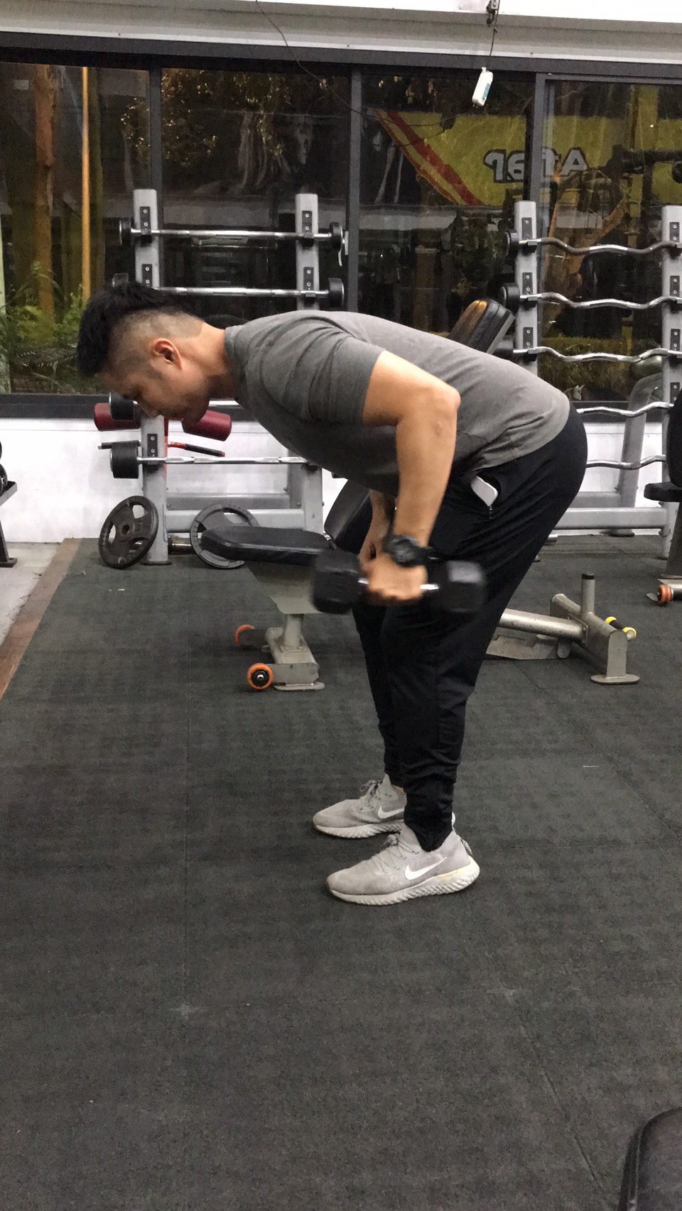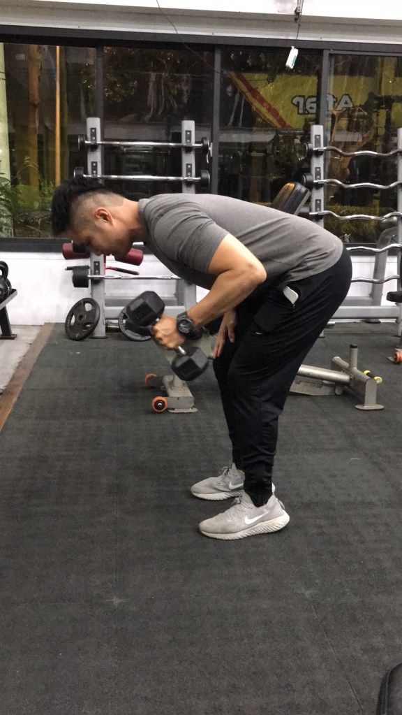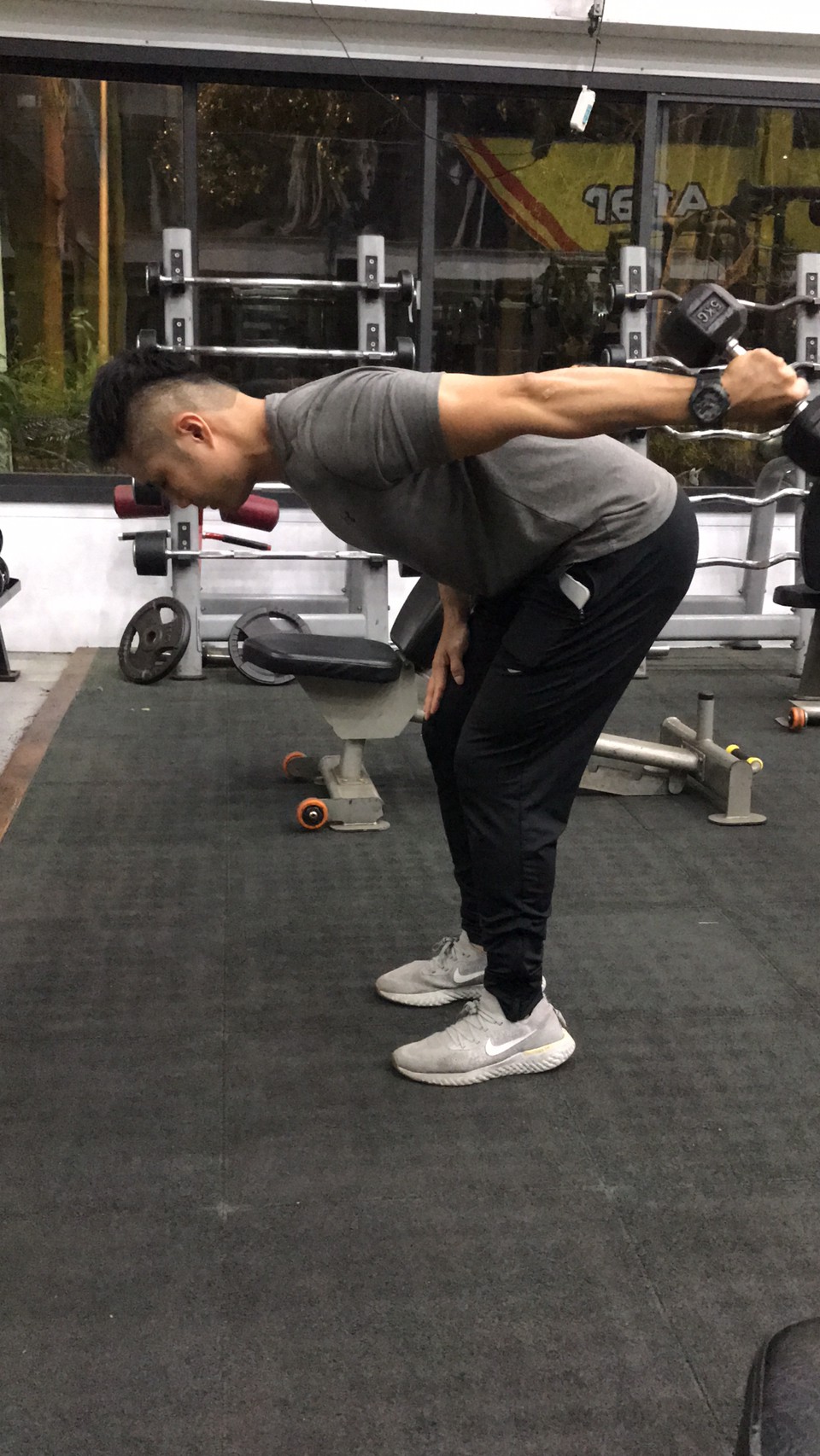 步驟:採取站姿前俯,雙腳與髖同寬,骨盆中立位置,胸肋上提肩胛後收下壓穩定,單手持啞鈴提至手肘 90 度位置為起始位置,另一隻手扶在同側的大腿上,吐氣時將手肘伸直,吸氣時將啞鈴下放置手肘約略 90 度,反覆操作。
