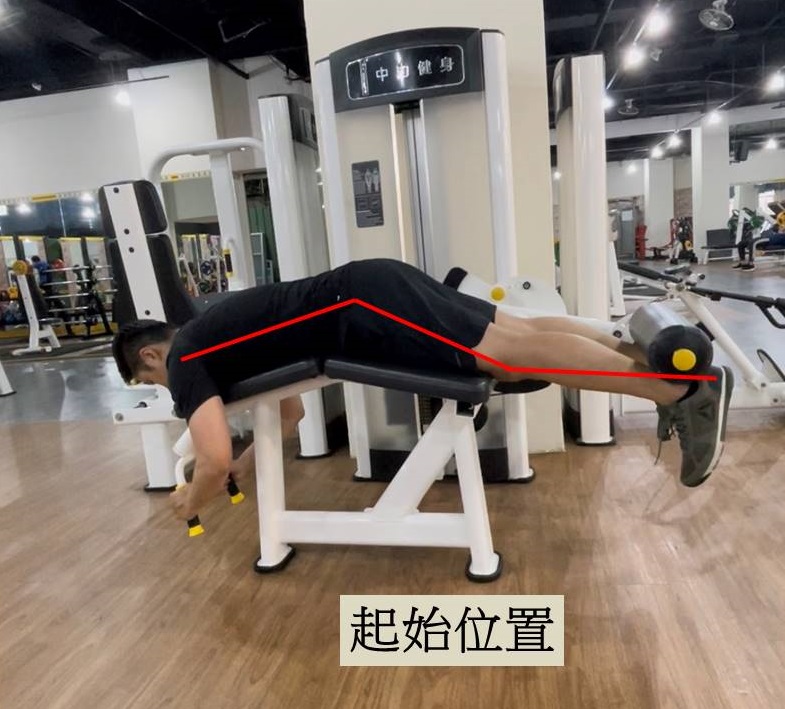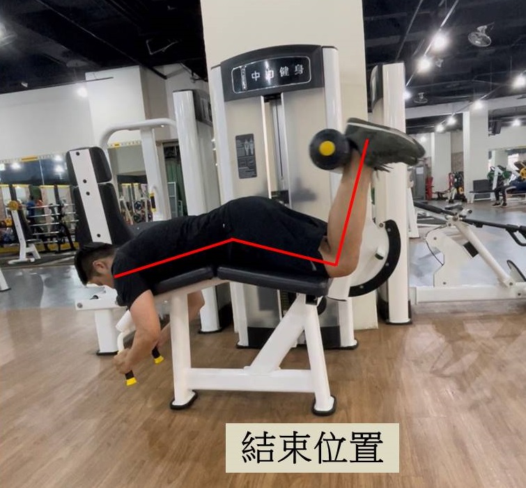步驟:將大腿貼在墊子上平趴於器材,膝蓋髕骨不接觸墊子,雙手抓握前方把手,下方滾筒墊置於後腳跟上,吐氣時勾起膝蓋至90度,吸氣時慢慢下放小腿,且器材槓片不相接觸以保持腿後肌肉張力。