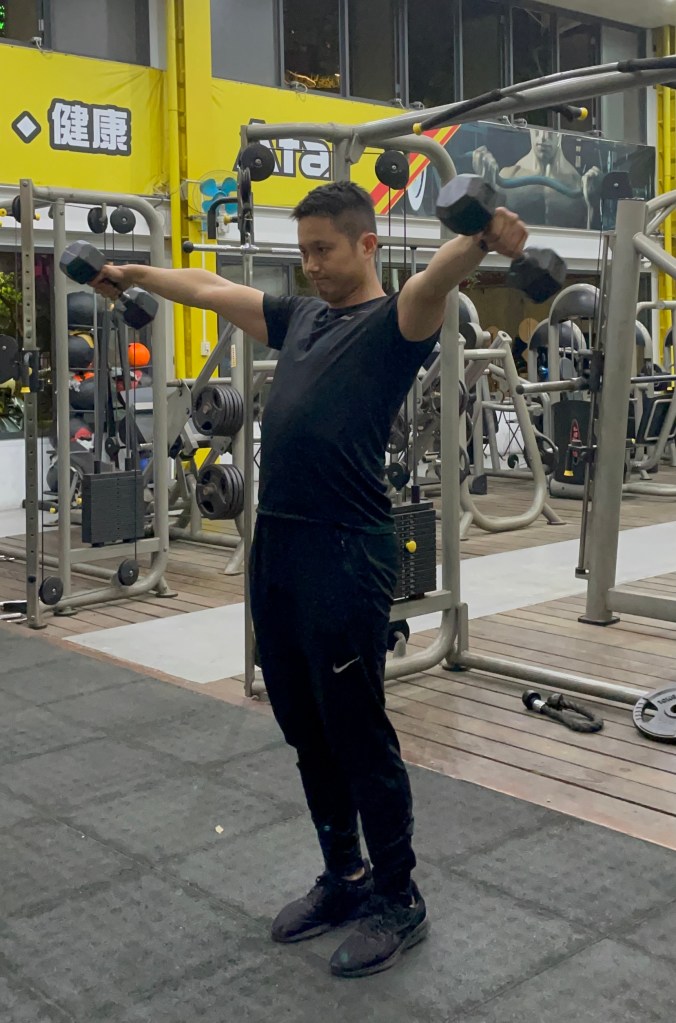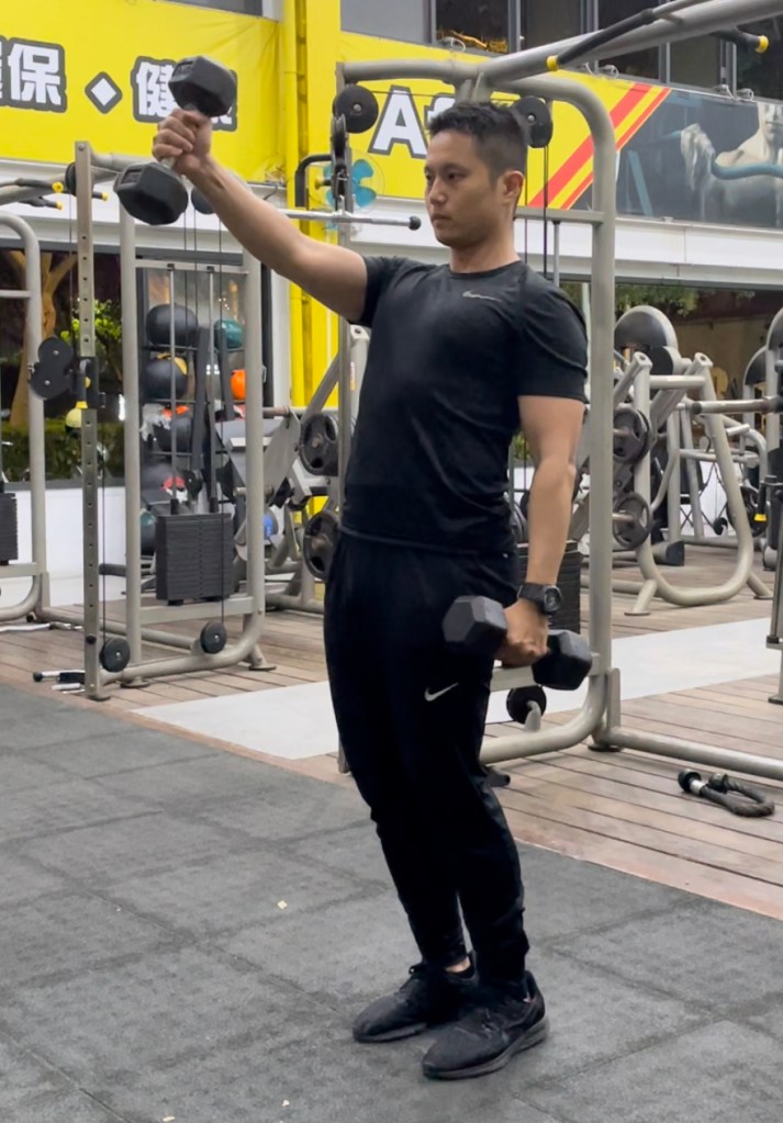 此動作可以說是肩膀訓練的經典動作,因為一次可以訓練到三角肌前束、中束,以及手臂後側的肱三頭肌,是一個高CP值的訓練動作!