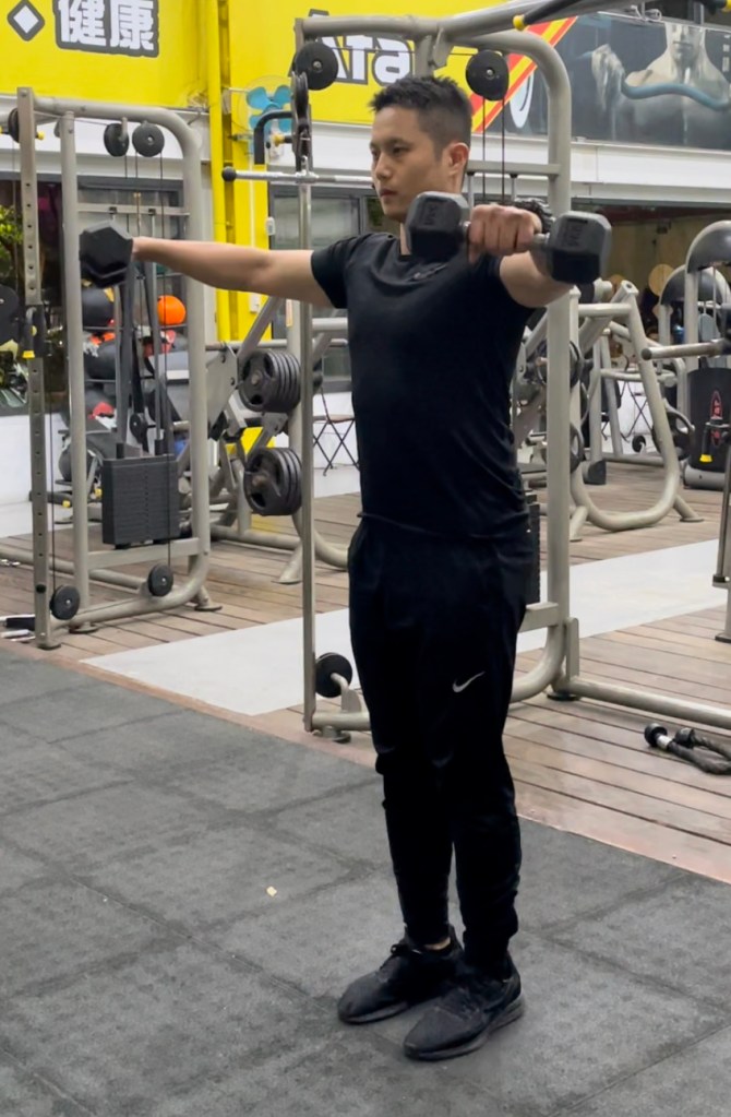 此動作可以訓練到三角肌中束,若以掌心朝地面的方式抬起肩膀,較容易造成肩峰下軟組織的擠壓,除了注意動作的操作幅度以外,可以改成大拇指朝天花板的方式抬起肩膀以降低受傷風險。