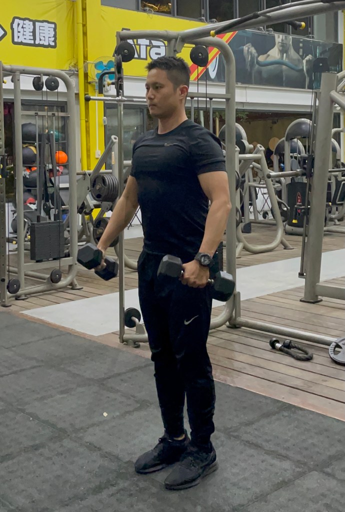 步驟:採取站姿,雙腳與髖同寬,膝蓋微彎不鎖死,骨盆保持中立,身體微微前傾並將腹部收緊保持穩定,手持啞鈴於身體兩側,(可單手或雙手操作)吐氣時將啞鈴抬起至上手臂平行地面,吸氣時下放啞鈴至起始位置,反覆操作。