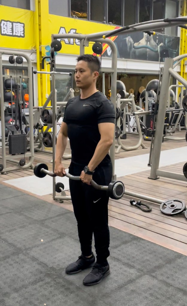 步驟:採取站姿,雙腳與髖同寬,膝蓋微彎不鎖死,骨盆保持中立,腹部收緊保持穩定,手持EZ Bar於大腿前方為起始位置,吐氣時將EZ Bar抬起至下胸切齊處,吸氣時下放 EZ Bar至起始位置,反覆操作。