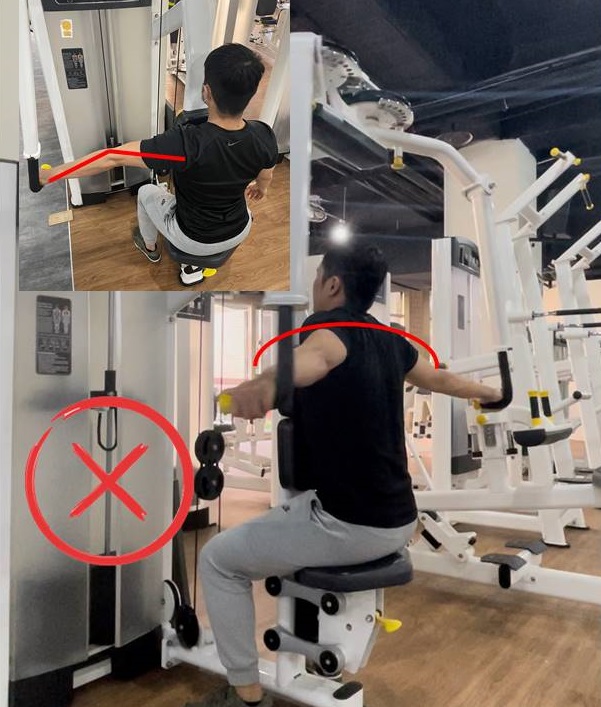 步驟採取坐姿,雙腳與髖同寬,膝蓋與腳尖朝前方,肩胛骨內收下壓穩定,手持握把於兩手臂平行處為起始位置,吐氣時將手臂向身體後方退至上手臂平行於身體位置,吸氣時回放握把至起始位置,反覆操作。