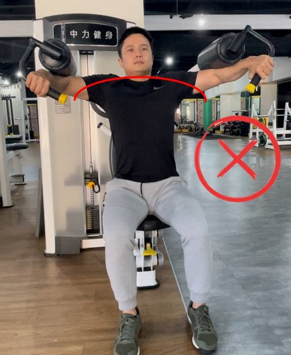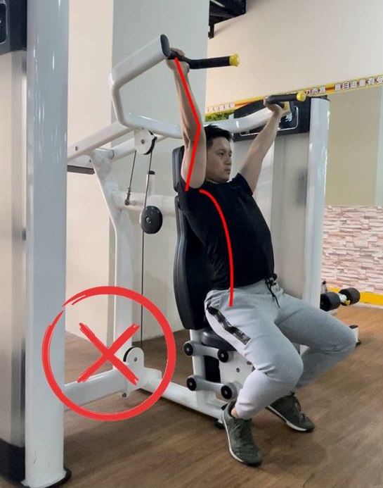 注意事項操作時下背不過度彎曲,以避免腰椎壓力,上推把手時不聳肩、手肘伸直不鎖死,手腕不壓迫,下放握把距離讓槓片與槓片不碰撞以保持肌肉張力,過程中保持順暢呼吸不憋氣。